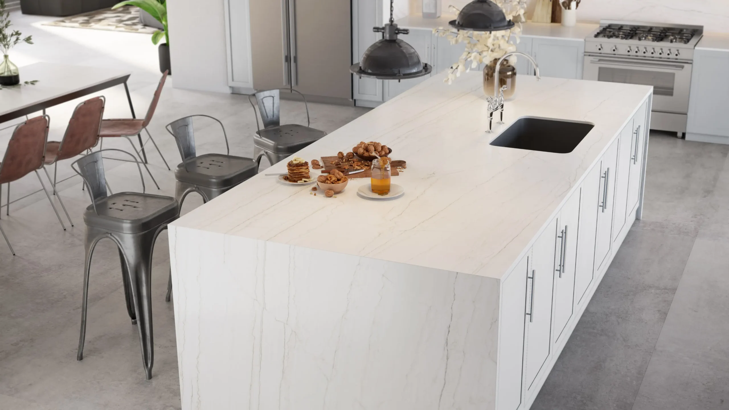 Inspirado por el deseo actual de interiores de mármol, Opera se inspira en el elegante mármol italiano de Carrara y ofrece un nuevo toque suave con el acabado Dekton Velvet Texture. Las vetas simples, de color gris claro, le agregan profundidad e interés a la superficie blanca y cremosa con un acabado subestimado clásico que ofrece un sensacional tacto suave aterciopelado.
