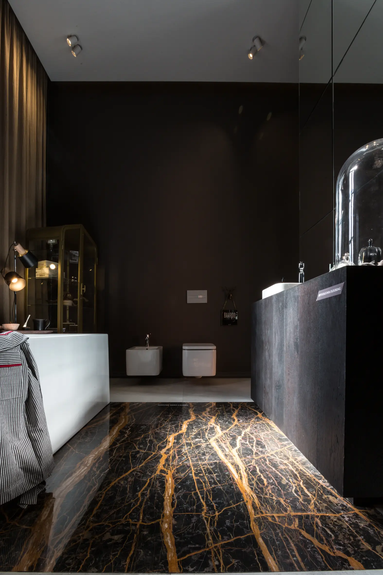 Intenso y con total personalidad, este material nos cautiva con su fondo negro y vetas que se entrecruzan drásticamente en tonos ocres casi dorados, blancos y grises. Permite generar un ambiente con carácter supremo, con cierta masculinidad y absolutamente refinado.