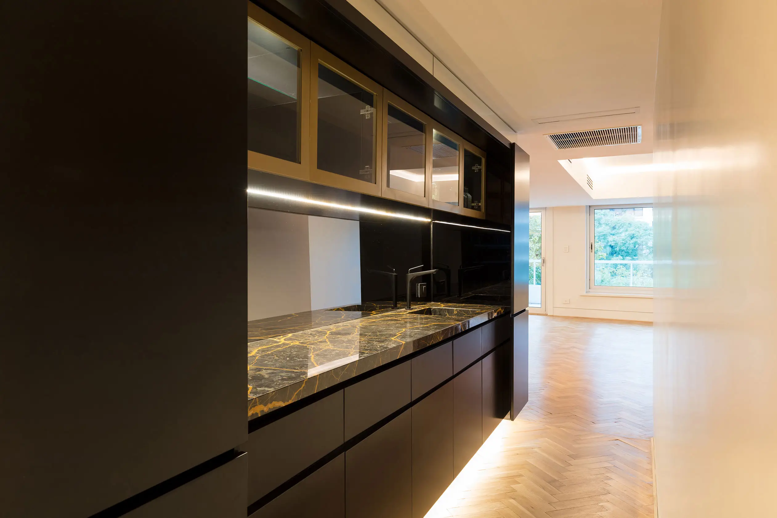 Este material es absolutamente combinable con todo tipo de materiales para plasmar diversos ambientes, desde los más elegantes y ostentosos, hasta los más neutros y minimalistas. Estéticamente se presenta con vetas blancas irregulares, que se lucen en mayor o menor medida según cada partida y contrastan a la perfección con su neto fondo negro.