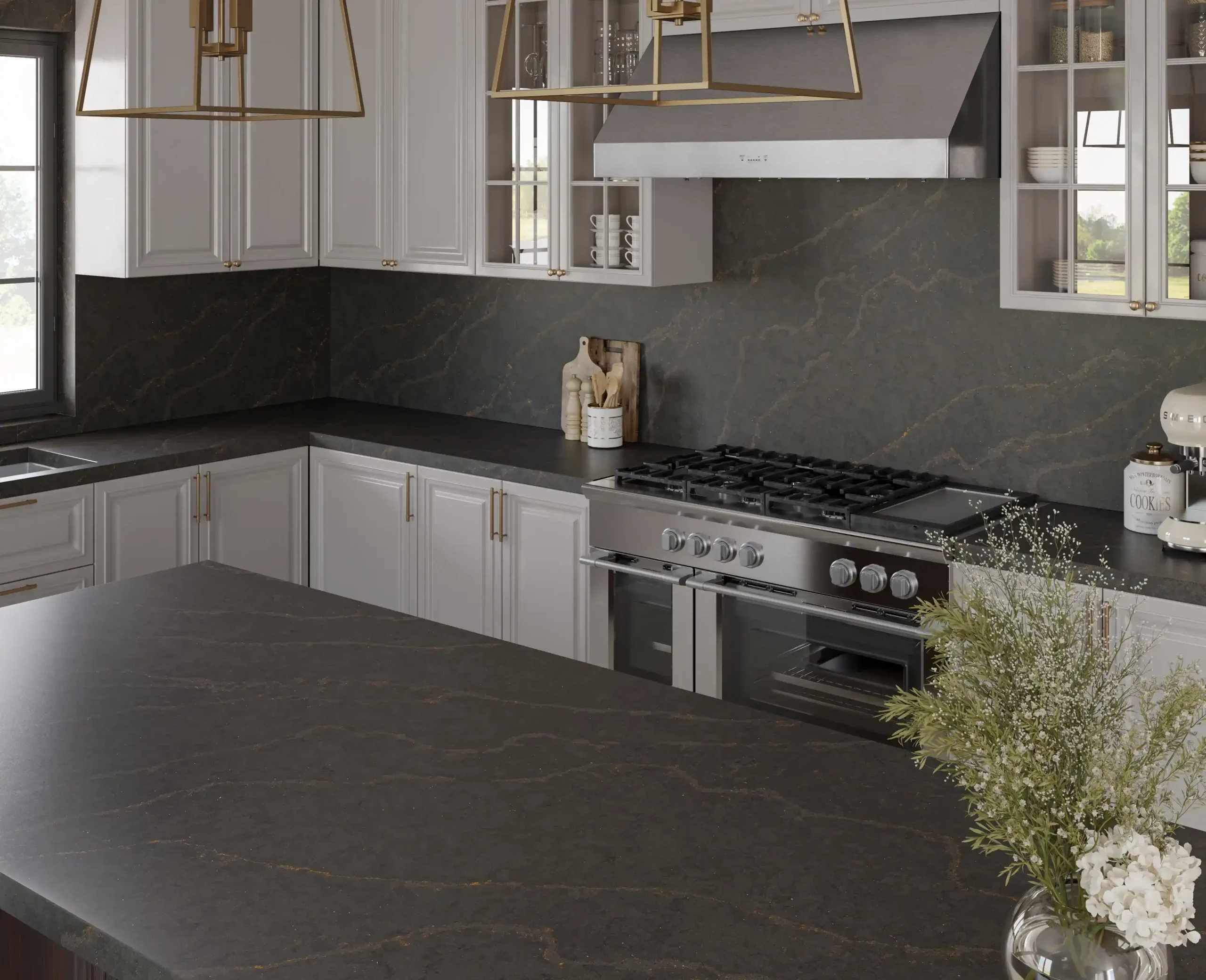 Es un gris oscuro en acabado mate cuya textura recuerda a una mezcla entre cemento y caliza. Tiene vetas sinuosas finas, con incrustaciones metálicas en tonos cobrizos y plateados. Inspirada en el movimiento de las coladas de lava más fluidas que generan cicatrices sobre el suelo volcánico.
